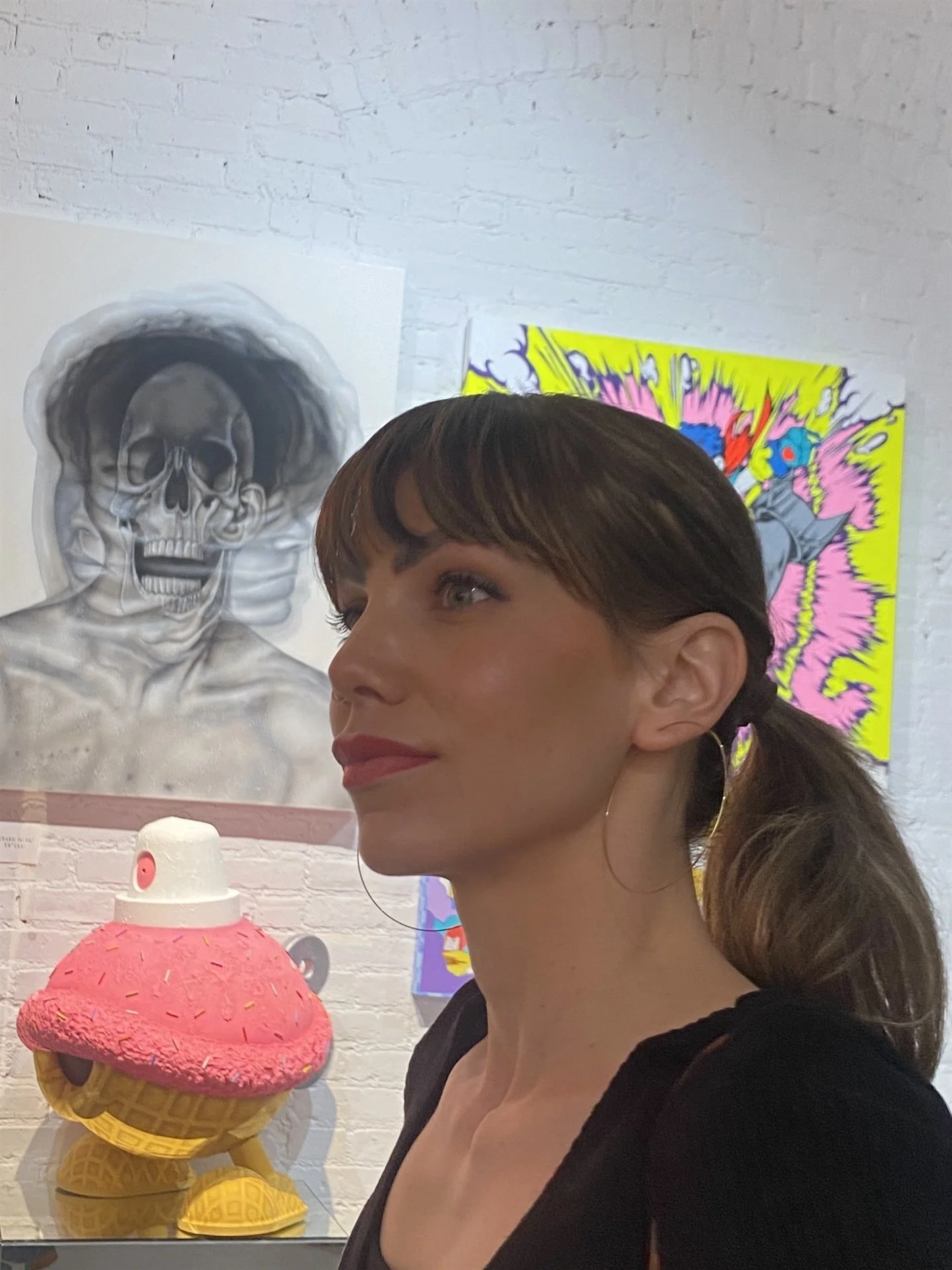 She works in paint, pen, and moving image, but her subject is constant: the fragile spark of presence. A candid portrait scrawled on a restaurant slip, a body suspended on canvas, a blink looped endlessly in animation.